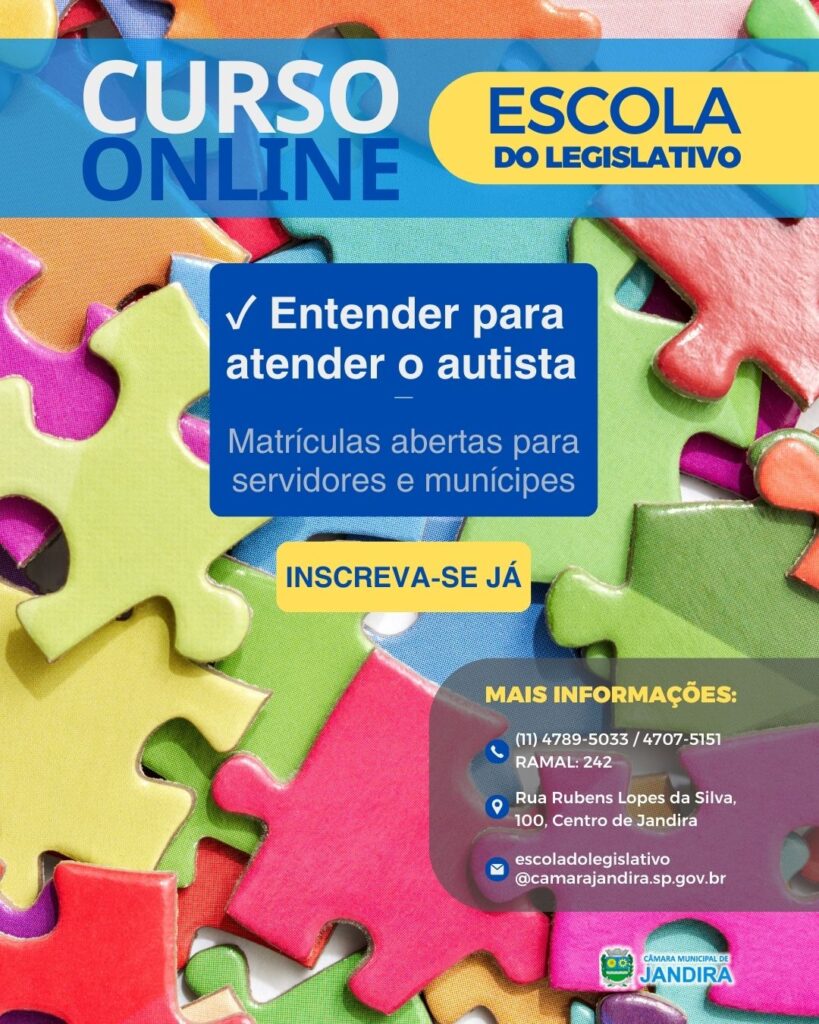 A Câmara Municipal de Jandira, sob a Presidência do vereador Silvair Soares de Brito (PP), informa a abertura das inscrições para o curso online “Entender para atender o autista”, disponibilizado na plataforma educacional da Escola do Legislativo “Vereador Luiz Carlos Soldé”.