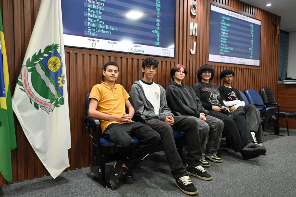 Na 38ª Sessão Ordinária, em 25 de novembro de 2025, os parlamentares da Câmara Municipal de Jandira aproveitaram o ensejo para homenagear os cidadãos que contribuíram para o desenvolvimento da cidade ao longo dos anos. A vereadora Camila Amorim da Silva (PRD), a “Camila Amorim”, concedeu Moção de Aplauso aos estudantes Sabrina Lima de Freitas Mazoni, Marília Lima de Freitas Mazoni, Caio Pimentel de Paula, José Guilherme da Silva e Lucas Gonçalves Santos, participantes do Programa “Prontos Para o Mundo” do Governo do Estado de São Paulo, convocados para realizar intercâmbio internacional no ano de 2026.