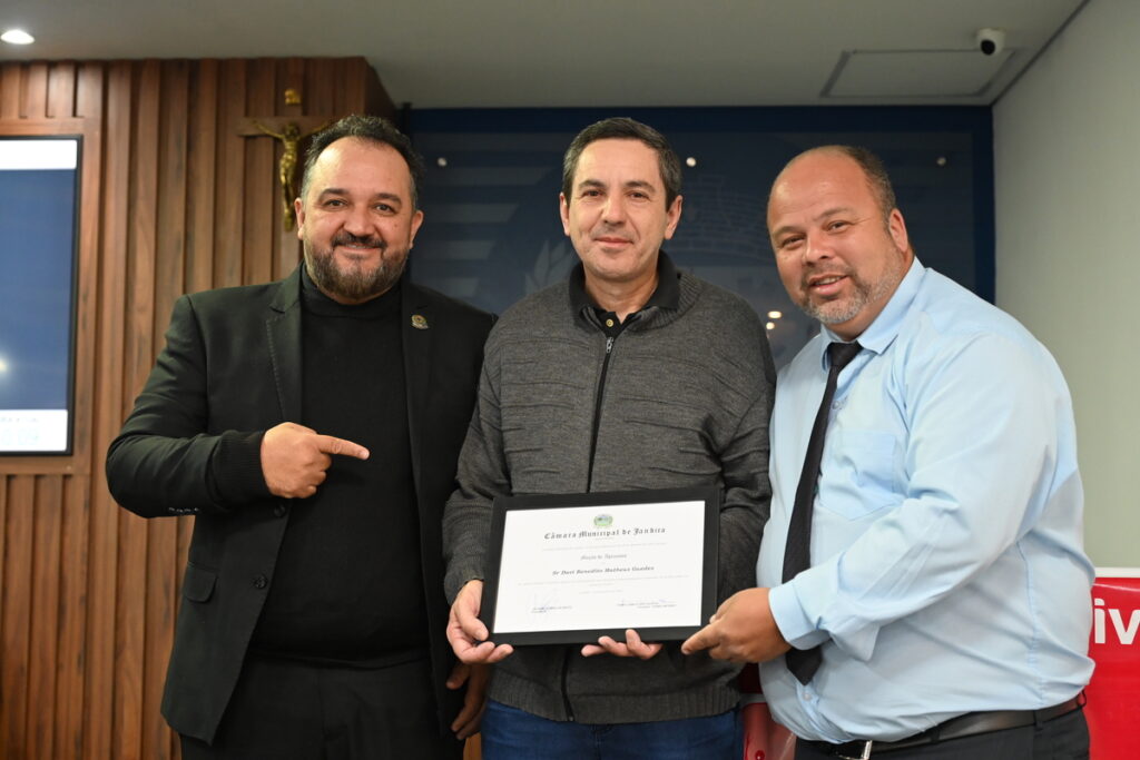 A Câmara Municipal de Jandira fez a entrega da Moção de Aplauso nº 25/25 durante a 33ª Sessão Ordinária, realizada no dia 21 de outubro de 2025. Subscrito pelos vereadores Fábio Camilo dos Santos (PT), o “Fábio Betera”, e Silvair Soares de Brito (PP), o “Silvio Cabeleireiro”, o documento registrou reconhecimento aos serviços prestados pelo senhor Davi Benedito Matheus Guedes à sociedade jandirense ao longo de sua carreira no serviço público.